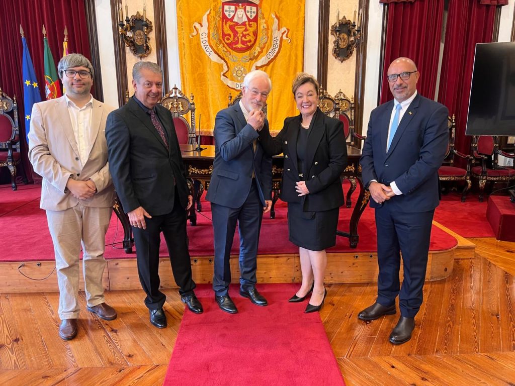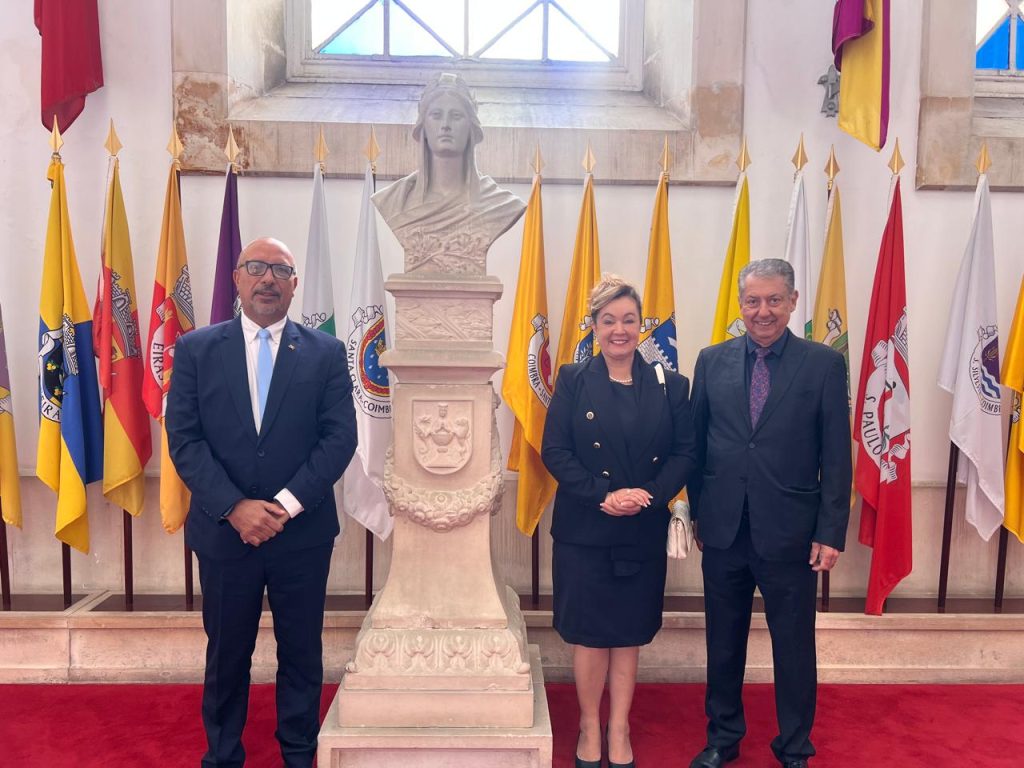 Nesta terça-feira, 29 de abril, a prefeita de Matrinchã (GO), Ivânia Fernandes, foi recebida pelo prefeito da cidade de Coimbra, em Portugal, José Manoel da Silva, em um encontro diplomático e estratégico voltado ao fortalecimento das relações bilaterais entre Brasil e Europa. O encontro contou ainda com a presença de Ivan Marques e Gilberto Moutinho, respectivamente presidente e secretário da Câmara de Comércio Brasil-Portugal da seção de Goiás (GO).